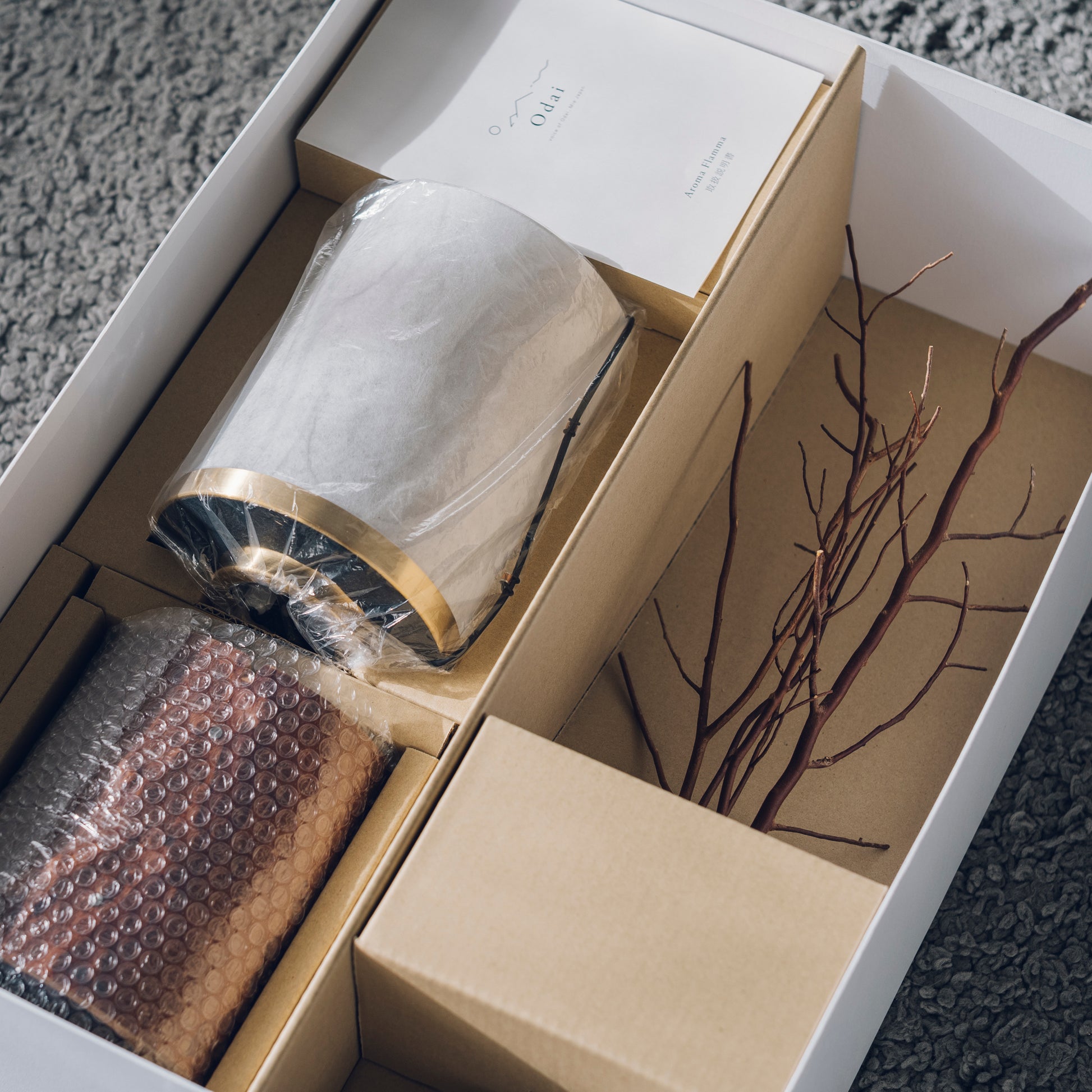 香料皿に同梱のオイルを垂らすと、灯りのそばから、まるで炎(Flamma)が揺らめくように、やさしく穏やかな香りが広がっていきます。ランプ内部のファンにより、生まれる静かな空気の流れが、森の香りをそっと運び、深呼吸したくなるような心地よさを空間に届けます。