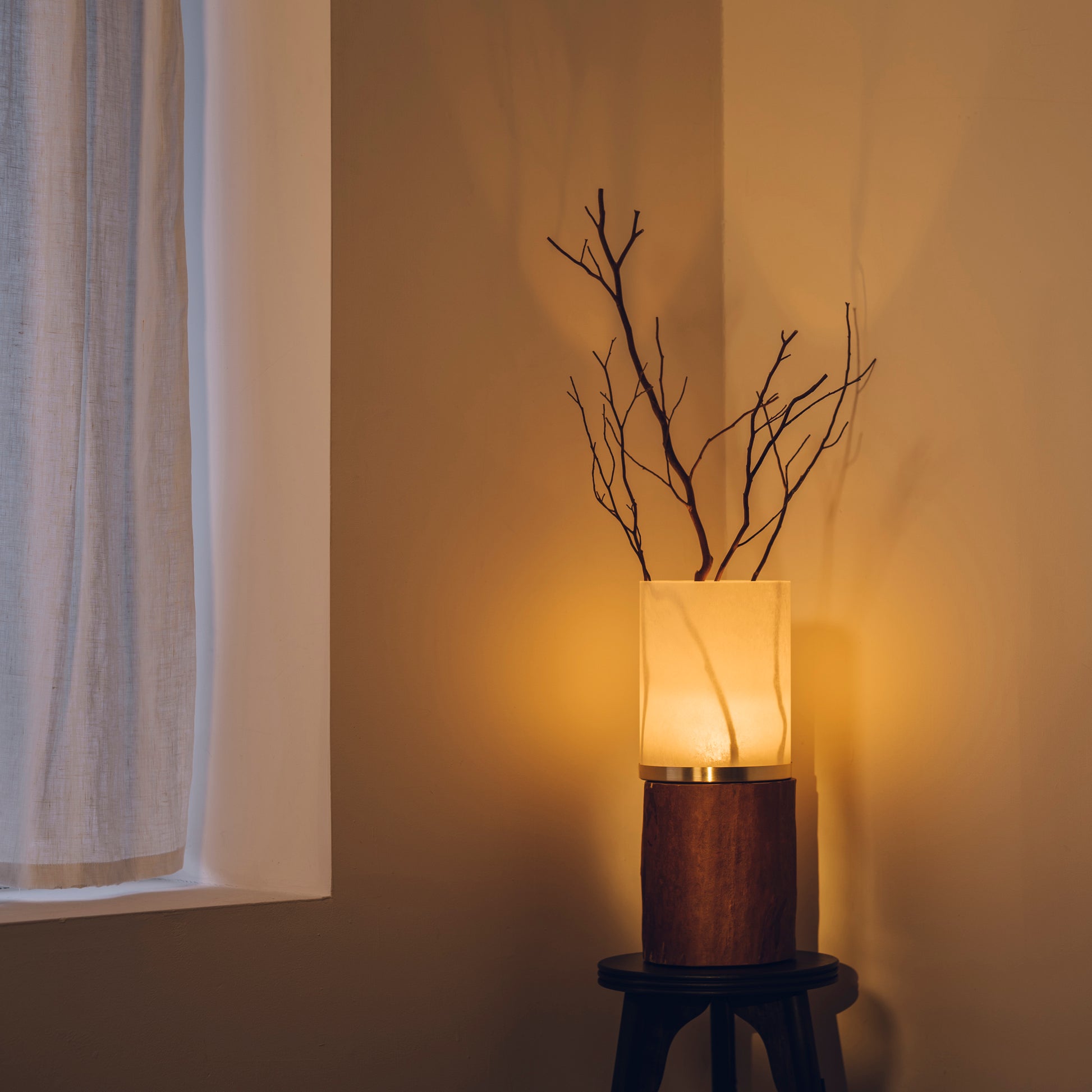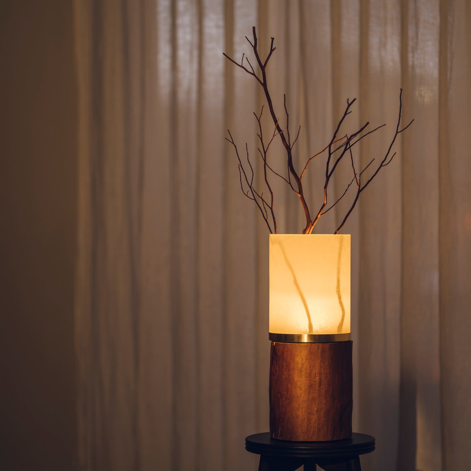 ランプの灯りは、一定ではなく、まるで焚火のようにゆらぎながら空間を照らします。その光を受けて枝の影もまた、静かに揺れ動き、森の中で風にそよぐ景色を思わせます。人工のリズムではない、自然に近いゆらぎが、視線と心をゆっくりとほどいていきます。